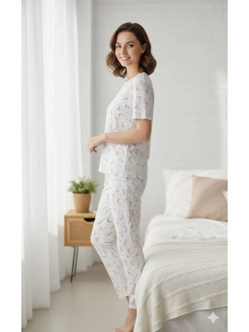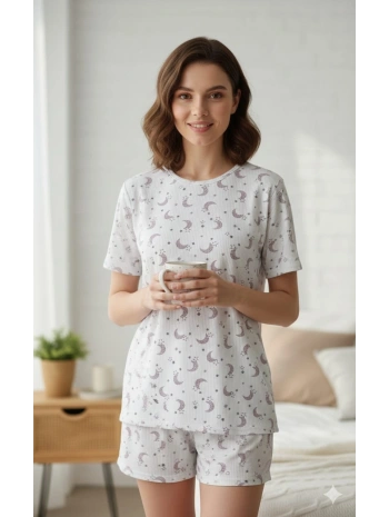 Kadın 3'lü Kısa Kollu Yüksek Bel Bisiklet Yaka Üst Alt Şort Pijama Takım