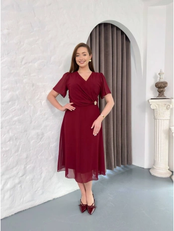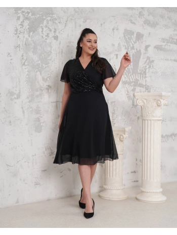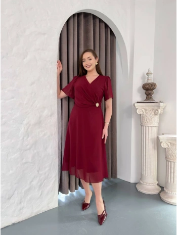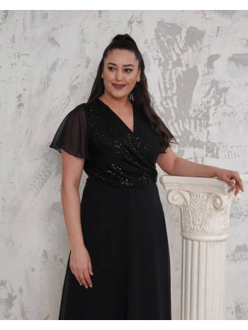 Kadın Büyük Beden Kruvaze Yaka Pul Detaylı Şifon Kısa Kollu Midi Abiye Elbise