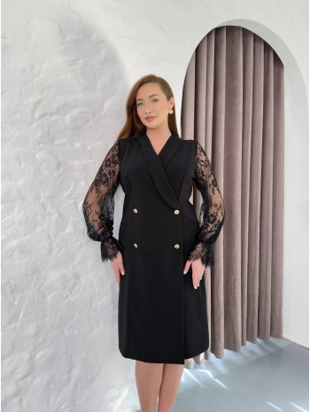 Kadın Büyük Beden Düğme Detaylı Dantel Kollu Midi Abiye Elbise