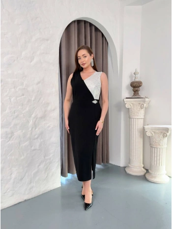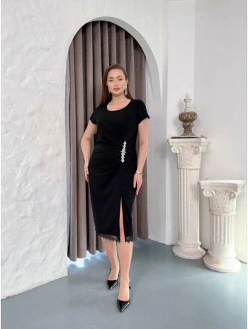 Kadın Büyük Beden Toka Detaylı Kısa Kollu Yırtmaçlı Siyah Abiye Elbise