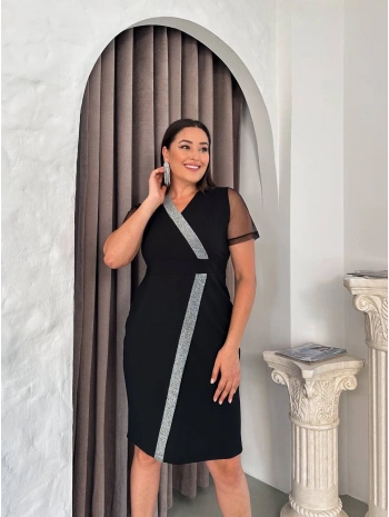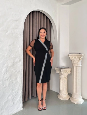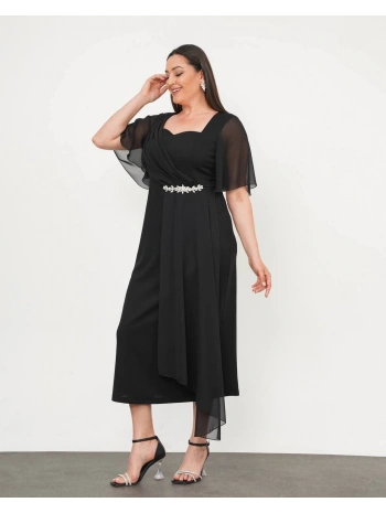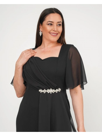 Kadın Büyük Beden Toka Ve Tül Detaylı Kısa Kollu Yırtmaçlı Siyah Abiye Elbise