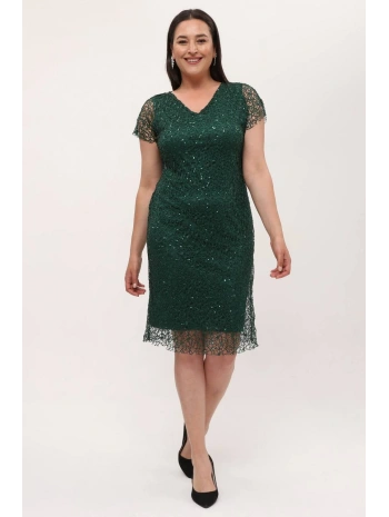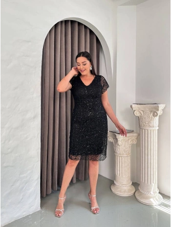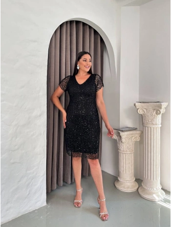 Kadın Büyük Beden Dantel Pul Detaylı Kısa Kollu Midi Abiye Elbise