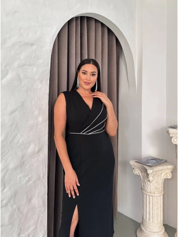 Kadın Büyük Beden Taş Detaylı Yırtmaçlı Kolsuz Abiye Elbise