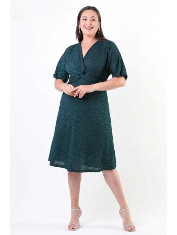 Büyük Beden Kruvaze Yaka Kısa Kolu Midi Boy Astarlı Simli Kumaş Elbise
