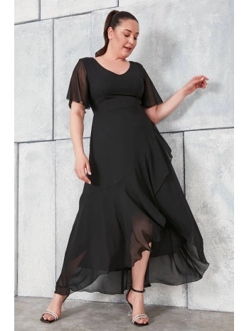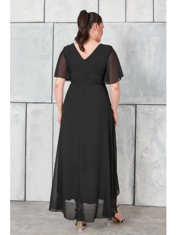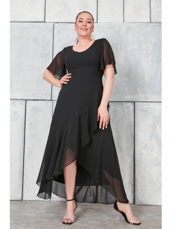 Büyük Beden Sırt Detaylı Tüllü Şifon Asimetrik Abiye Elbise