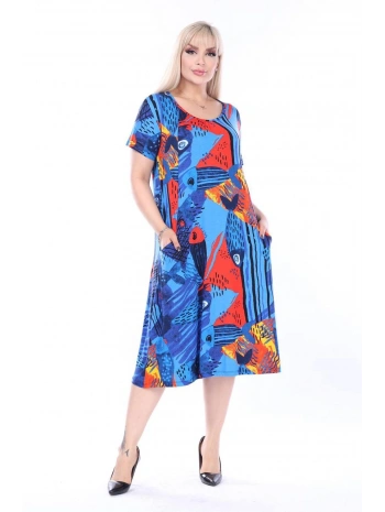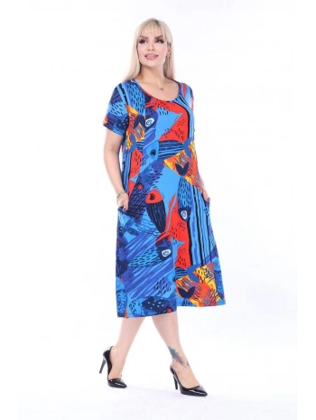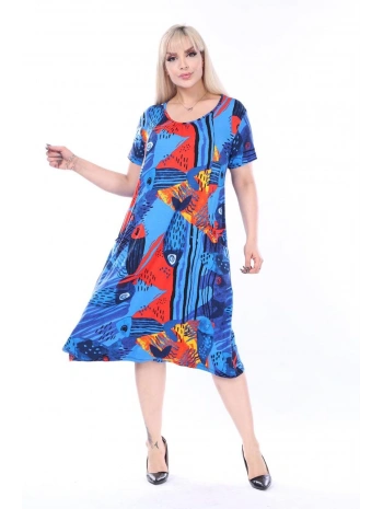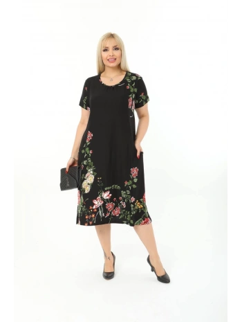 Kadın Büyük Beden Kısa Kollu Baskılı Cepli Viskon Elbise