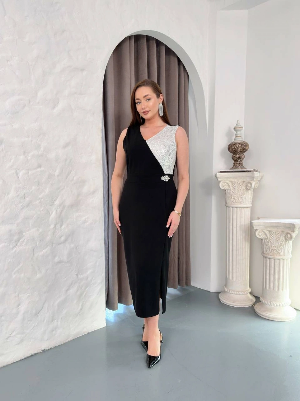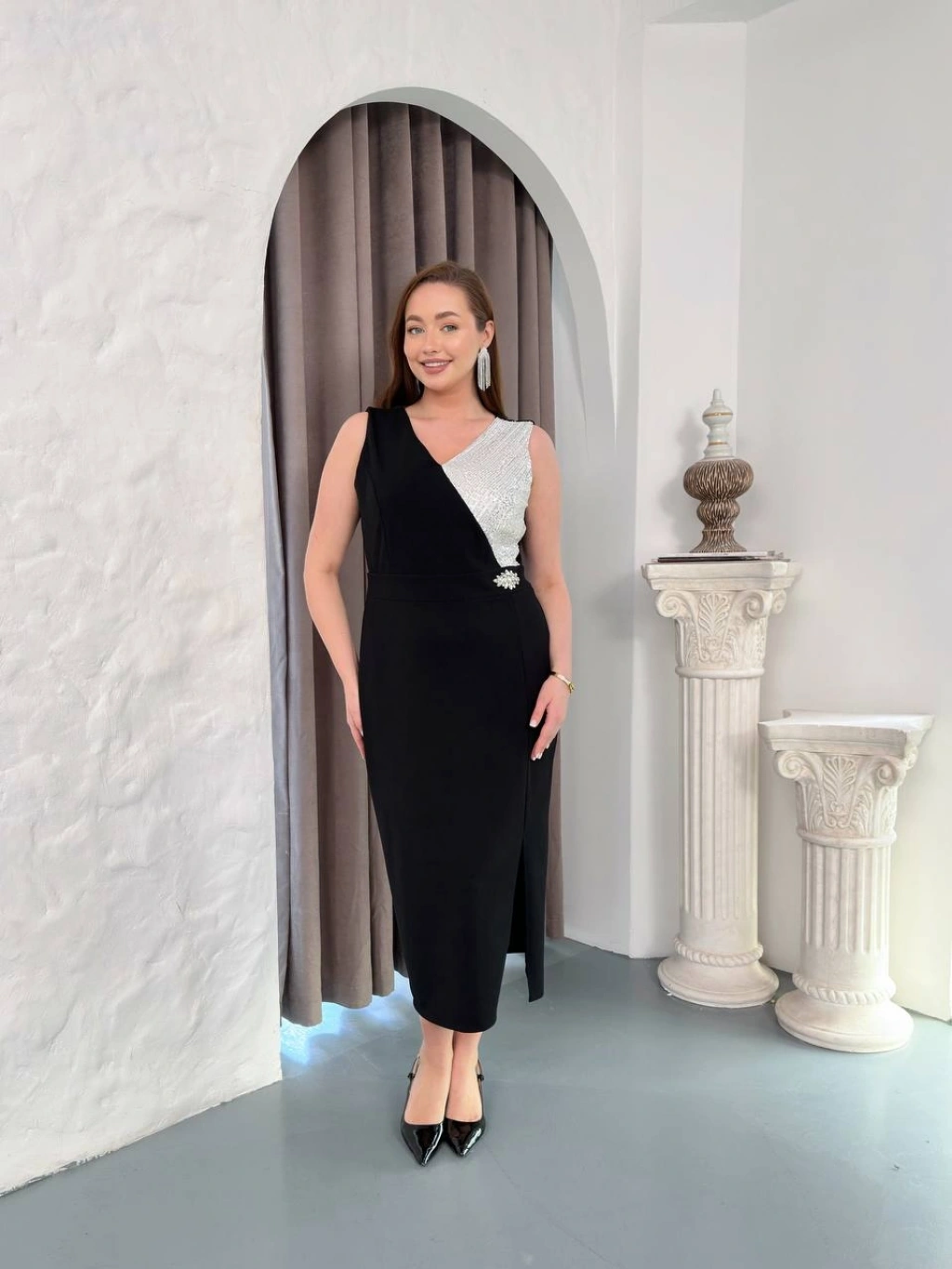 Kadın Büyük Beden Üst Detaylı Kolsuz Yırtmaçlı Abiye Elbise