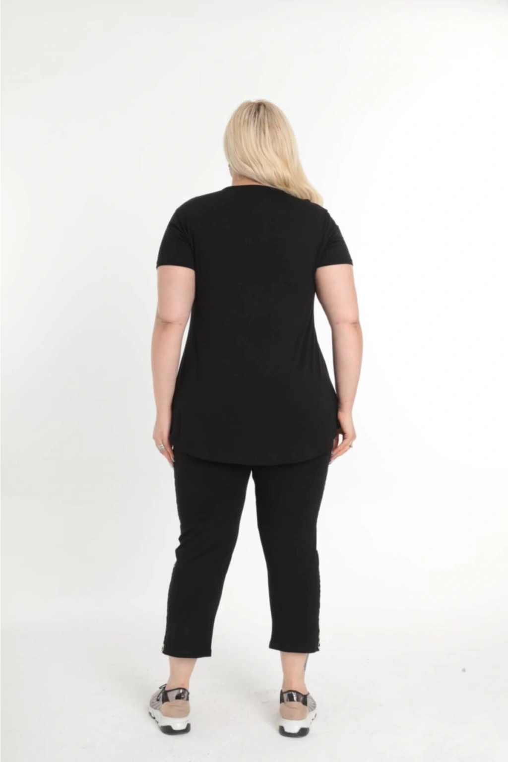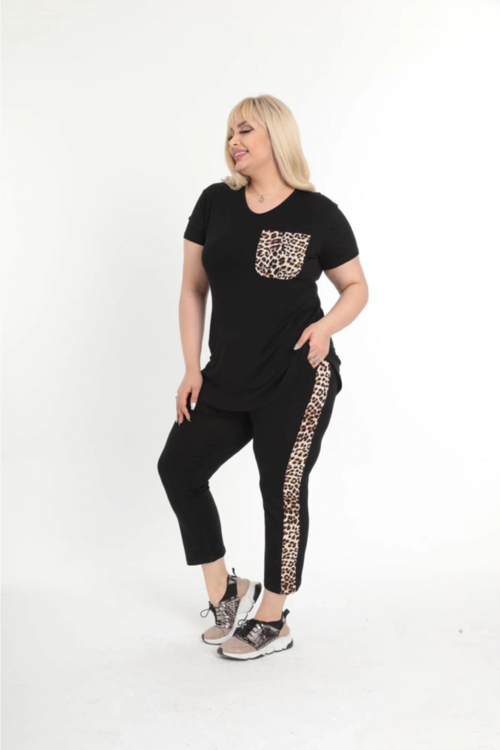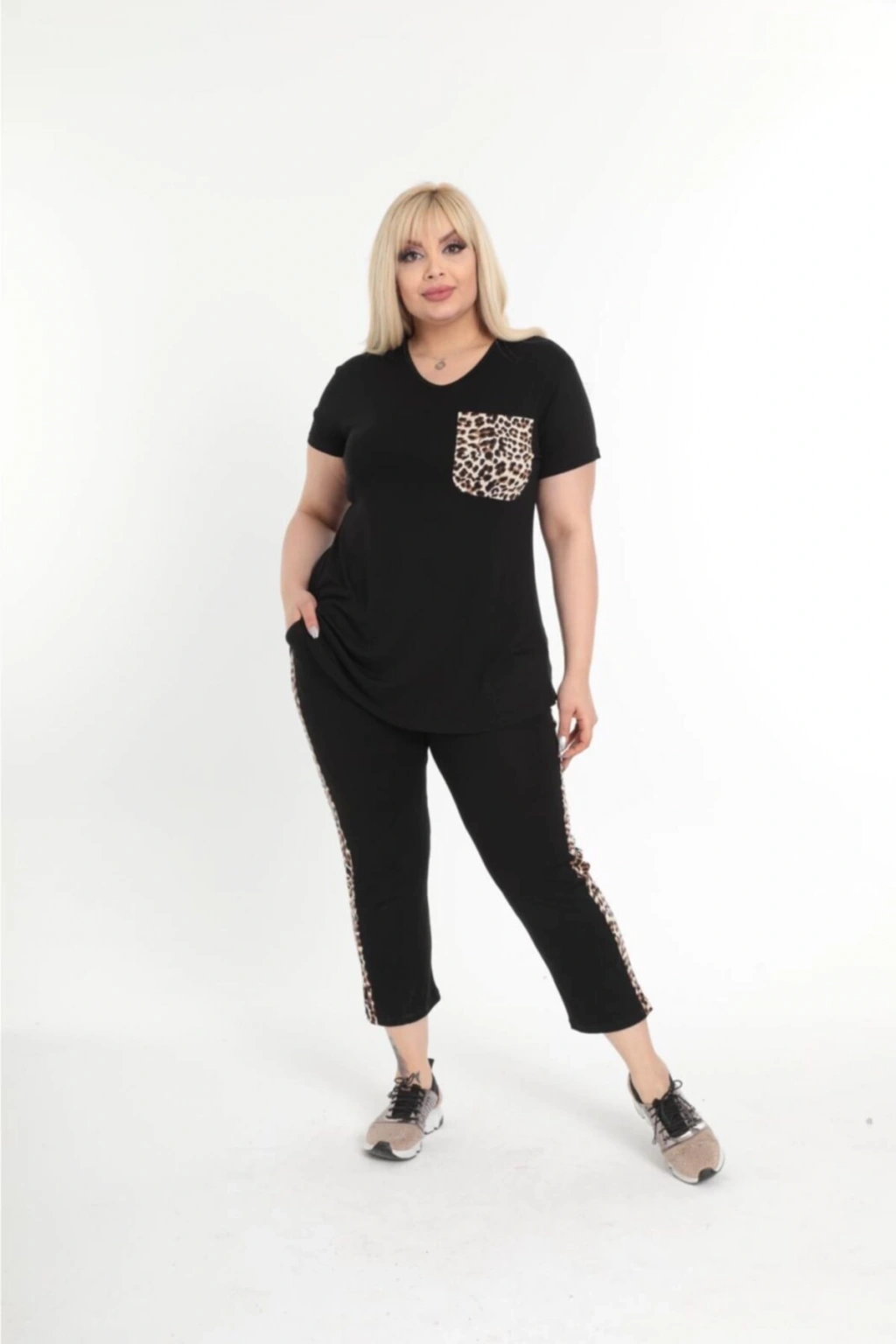 Kadın Büyük Beden Siyah Cep Ve Şerit Leopar Detaylı Yazlık Kapri Eşofman Takımı