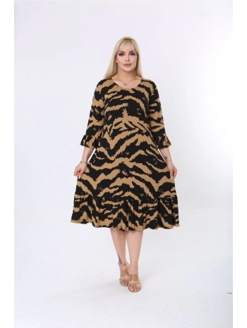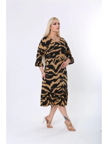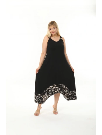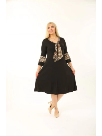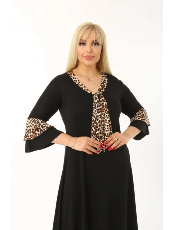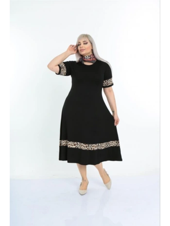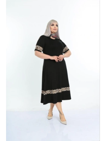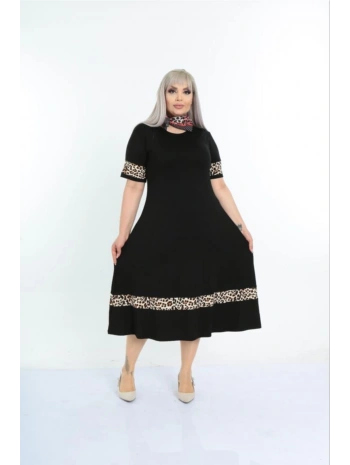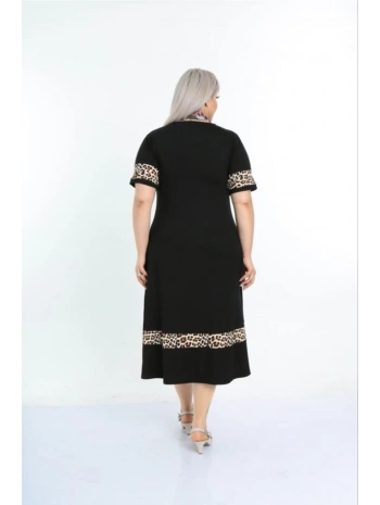Kadın Siyah Kol ve Etek Ucu Leopar Desenli Büyük Beden Elbise