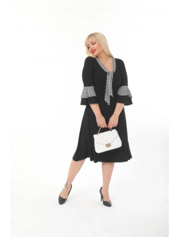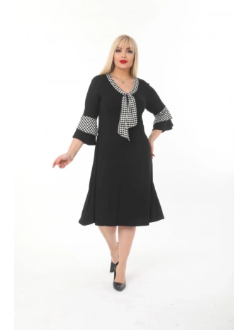 Kadın Büyük Beden Kravat Desenli Siyah Midi Elbise