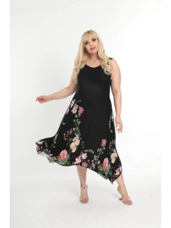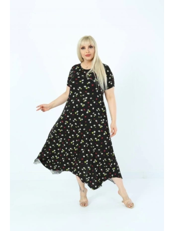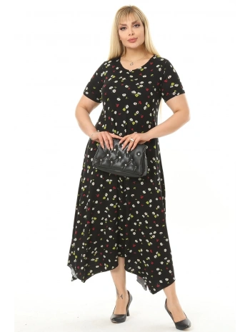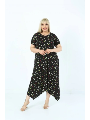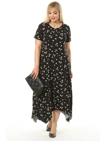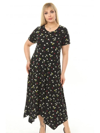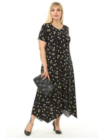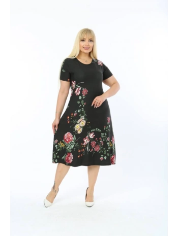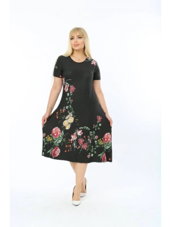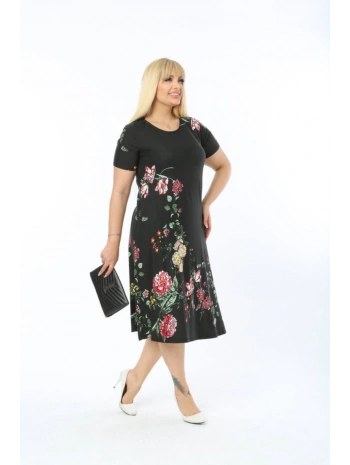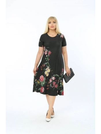 Büyük Beden Çiçek Desenli Siyah Kısa Kol Elbise
