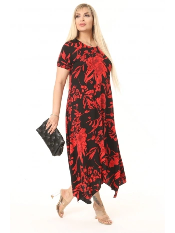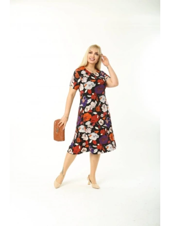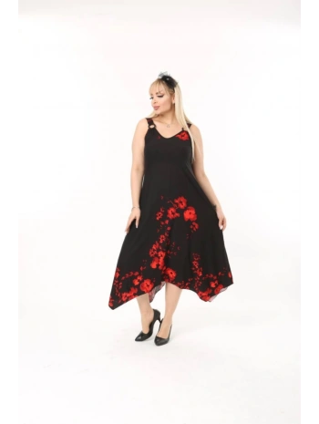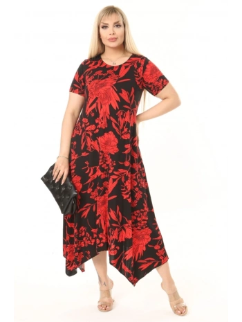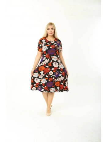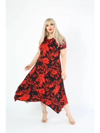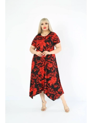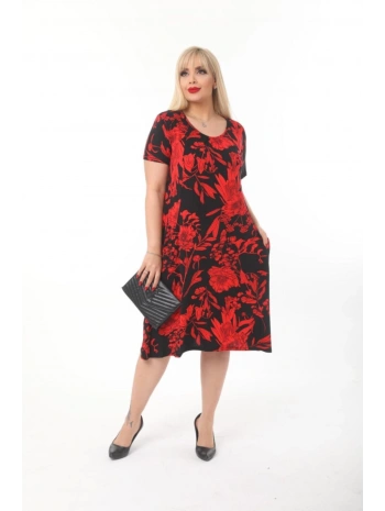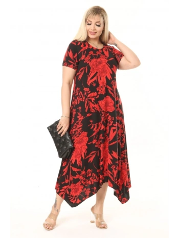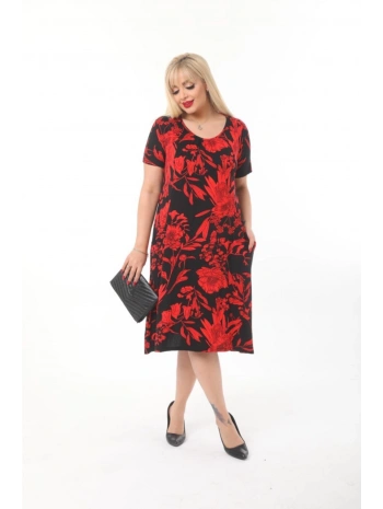 Büyük Beden Kırmızı Çiçek Desenli Siyah Kısa Kol Elbise