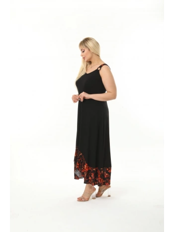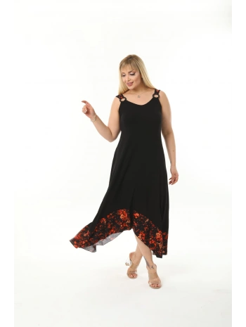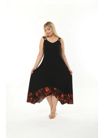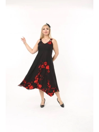 Kadın Büyük Beden Tokalı Askılı Çiçek Desenli Siyah Elbise