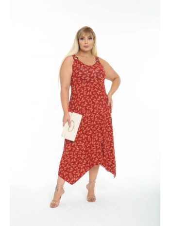 Kadın Büyük Beden Tokalı Askılı Kelebek Desenli Kırmızı Elbise