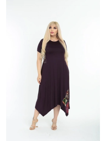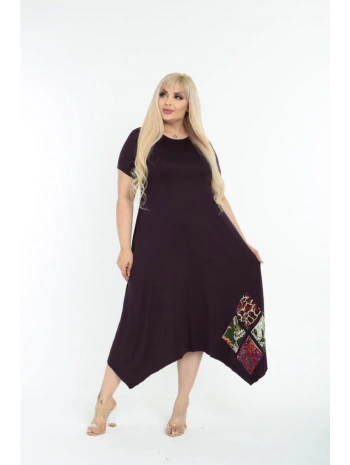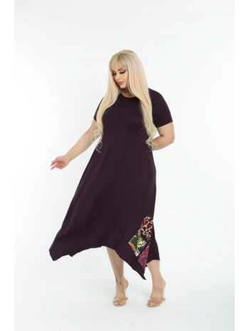 Kadın Büyük Beden Yamalı Bisiklet Yaka Kısa Kollu Mürdüm Elbise