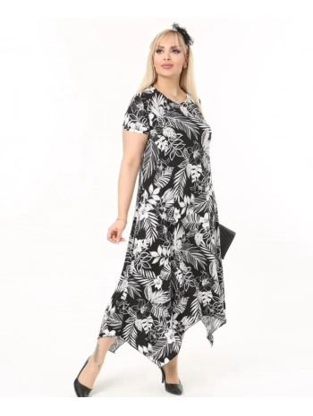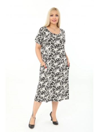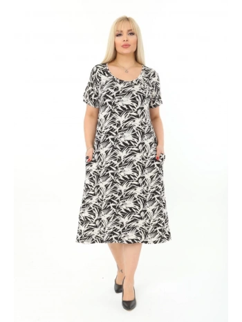 Büyük Beden Siyah Beyaz Yaprak Desenli Kısa Kol Elbise