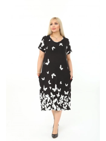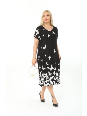 Büyük Beden Siyah Kelebek Desenli Kısa Kol Elbise