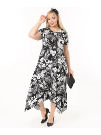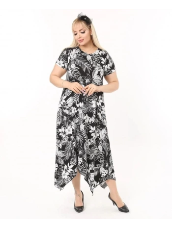Kadın Büyük Beden Desenli Kısa Kollu Asimetrik Etekli Elbise