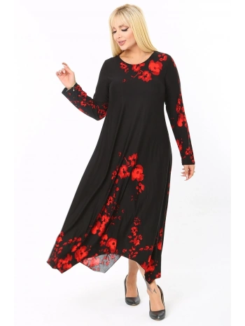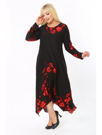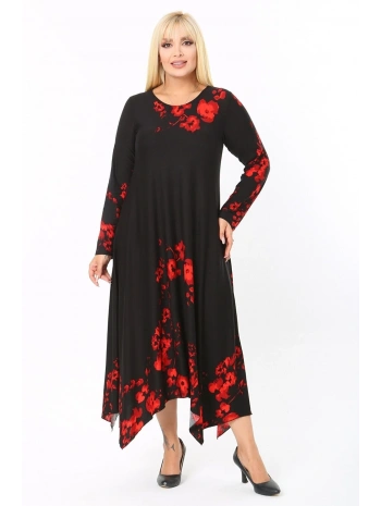 Kadın Uzun Kollu Asimetrik Çiçek Desenli Büyük Beden Elbise