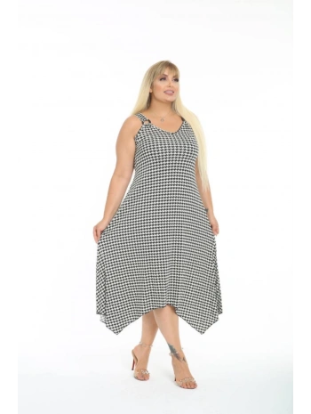 Kadın Büyük Beden Tokalı Askılı Kazayağı Desenli Elbise