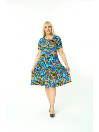 Kadın Büyük Beden Kısa Kollu Midi Boy Mavi Desenli Elbise