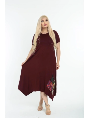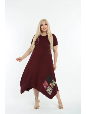 Kadın Büyük Beden Yamalı Bisiklet Yaka Kısa Kollu Bordo Elbise