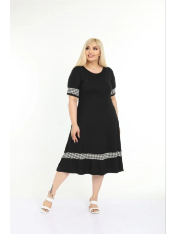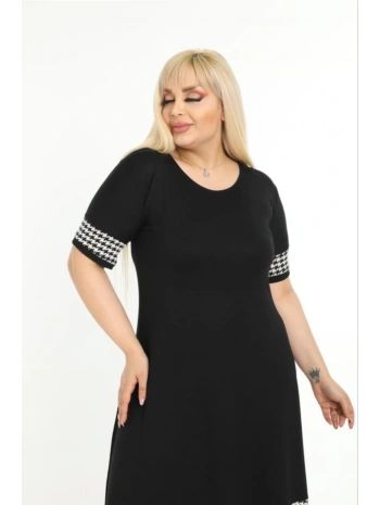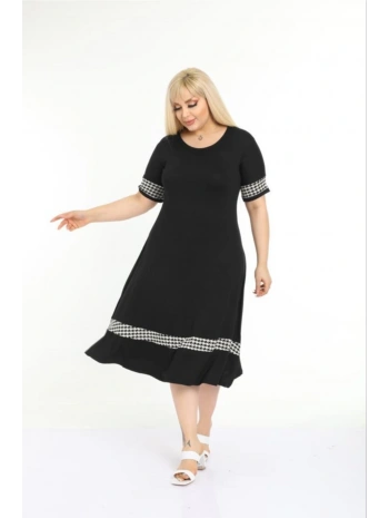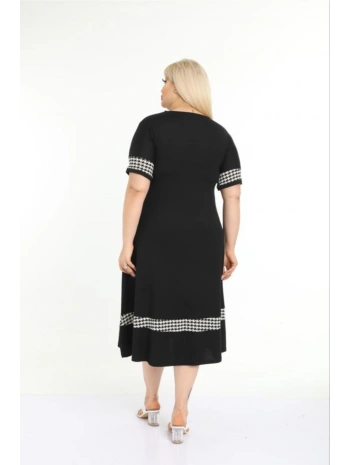 Kadın Siyah Büyük Beden Kol ve Etek Ucu Kazayağı Desenli Elbise