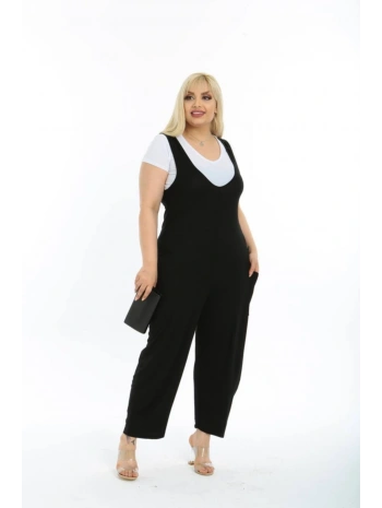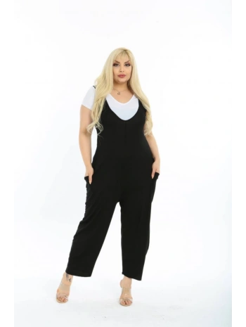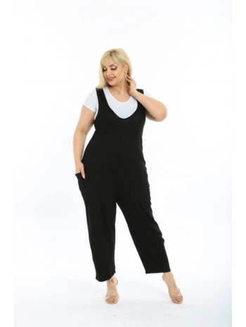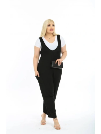 Kadın Büyük Beden Salopet Yaka Siyah Tulum