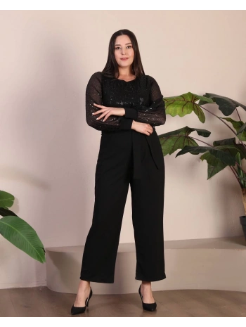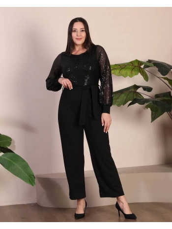 Büyük Beden Pul Payet Detaylı Bisiklet Yaka Kuşaklı Abiye Tulum