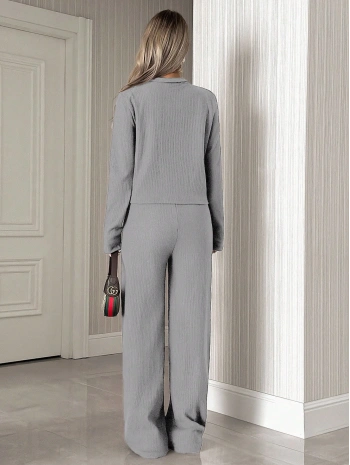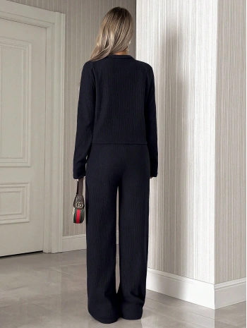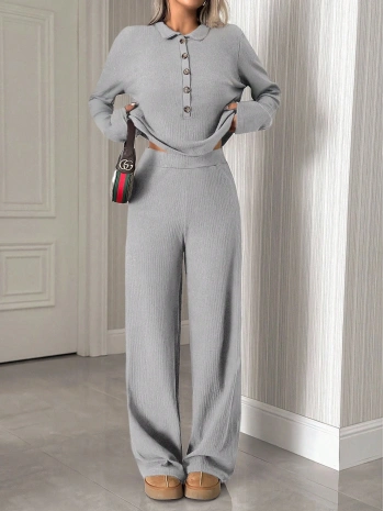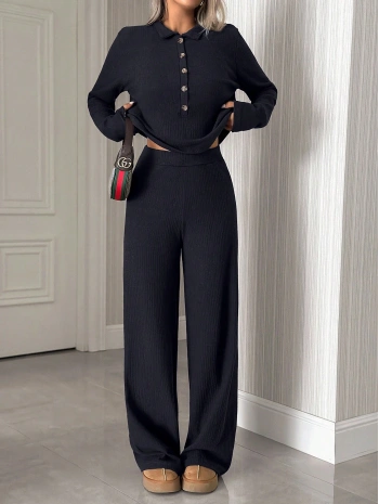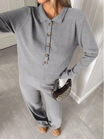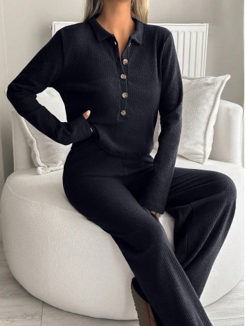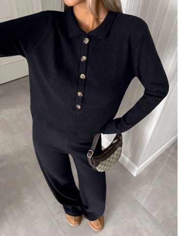 Kadın Uzun Kollu Yaka Düğmeli Yüksek Bel İkili Takım
